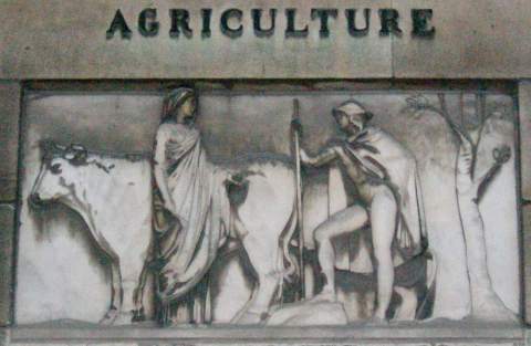 Jean-Joseph Espercieux (1757-1840) La fontaine est décorée de quatre bas-reliefs : l'Agriculture, la Paix, le Commerce et les Sciences et les Arts. |